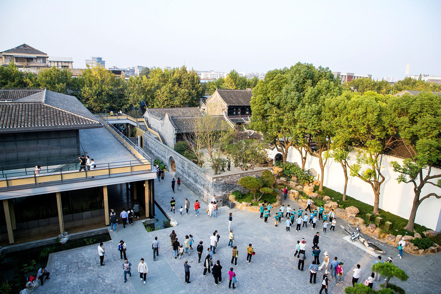 物尽其用是每幢建筑应有的使命,有些不是文保单位的老建筑承载一代人的记忆,不能说拆就拆,加固维护还能发挥作用。如何使其有机融入片区,既与整体风格保持一致,又留下历史印记,更体现时代风貌。广陵古城人张开了开放的胸襟,在众说纷纭中集思广益;展示了超凡的智慧,在力排众议中达成双赢;体现了果敢的担当,在犹豫观望中勇毅前行。借鉴古代造园技术,采用现代设计理念,靠回廊复道将本来格格不入的老建筑与文保单位巧妙连接,以青灰色的外立面和大屋顶将原来难以协调的老建筑与文保单位和谐融入,为未来片区更新做了示范。由于引进了特色餐饮服务业,实现了功能重置,“广陵有盐”人间烟火与艺术时尚相得益彰。游人的络绎不绝,食客的高朋满座,自媒体网红的热传,这个想假都很难。