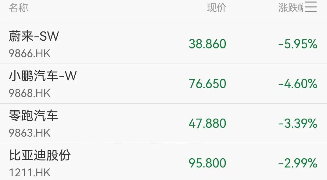 港股轿车股跌幅居前,蔚来跌近6%,小鹏轿车跌超4%、零跑轿车跌超3%,长城轿车跌超6%。