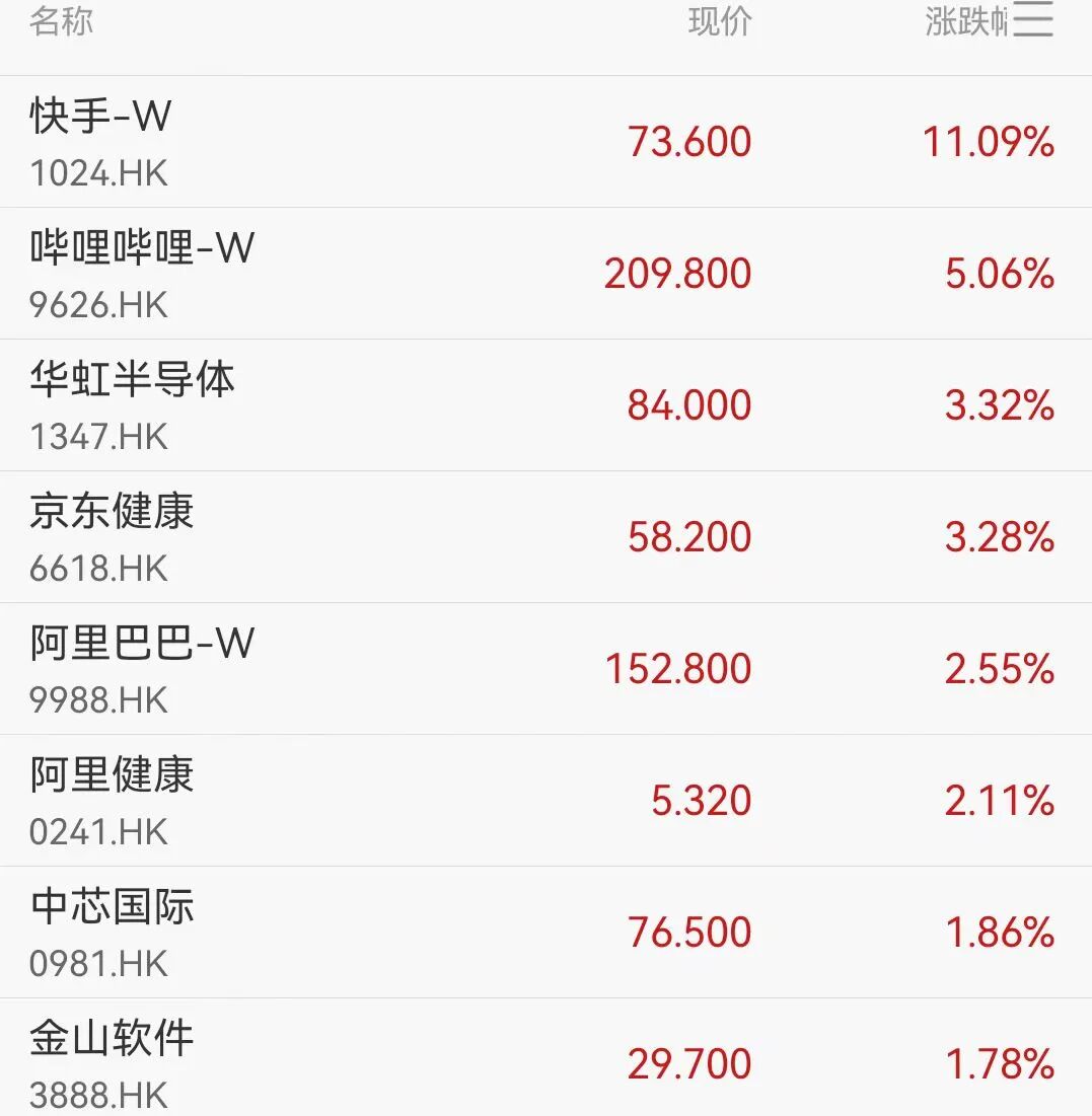 科网股走势分解,快手涨超11%,哔哩哔哩涨超4%,阿里巴巴涨超2%,网易、小米跌超2%。